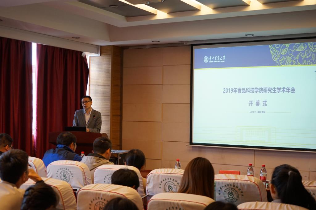 主持人蔡礼彬首先介绍到场嘉宾,紧接着介绍今年学术年会的主题。今年的食科院2019年研究生学术年会将延承学校“学术规范与学术创新”的活动主题,引导广大研究生培养严谨规范的科学态度和自主创新能力,同时通过开展一系列丰富多彩的学术文化活动,为广大同学搭建“培养学术精神,展示学术风采,共享学术成果”的舞台。