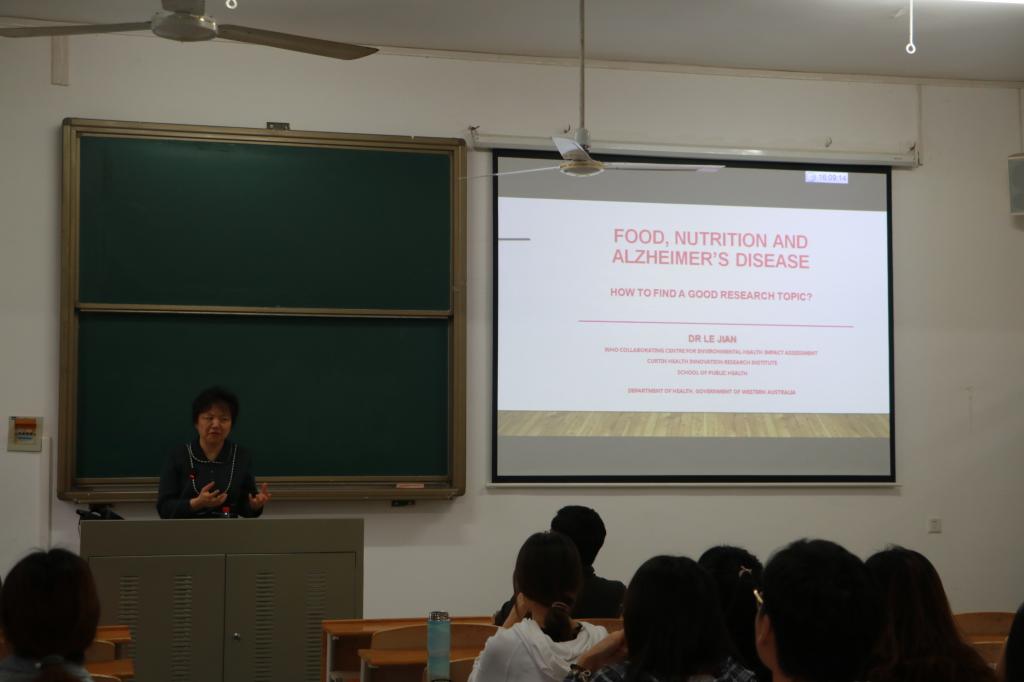 (食品科学技术通讯员 陈欢 供图 陈欢 李萌)2019年10月14日下午16:00,西澳洲卫生部高级研究员和分析师、科庭大学公共卫生学院客座教授JIAN LE 教授在一教303做了一场主题为“Food, Nutrition And Alzheimer's Disease”的精彩学术报告。报告由胡筱波教授主持,食品科学技术学院多名硕士生参加了此次会议,现场师生积极互动,学术氛围浓厚。