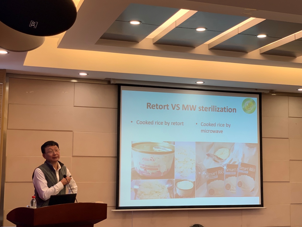 报告开始,Sirichai Songsermpong助理教授先介绍了什么是微波烤箱,并对比传统加热方式进行了详细的说明。随后,讲解了微波加热原理,并对微波的应用进行举例,如牛奶在连续微波系统中的巴氏杀菌、胡萝卜脆片、香蕉脆片的生产等。从固定成本和经营成本、干燥时间、是否需要铝箔或金属包装等方面对冷冻干燥机和微波真空机进行了详细的对比,突出了微波真空机的优势。接着,对工业中常用的微波炉进行了充分的展示,如微波流化床干燥、微波辅助热灭菌、带旋转篮的微波真空炉等。最后总结了微波所面临的挑战,具体表现在:泰国只有10位微波设计工程师,10多位食品科学家使用微波炉,且很少使用工业微波烤箱;一些消费者仍然对微波加热有错误的认识;食品工业将如何采用这项技术等。