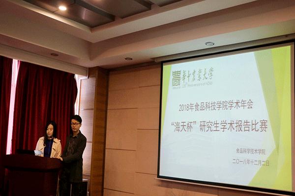 核心提示:12月2日,2018年中国·太阳集团tyc33455(股份有限公司)“海天杯”研究生学术年会—学术报告比赛在食科楼504举行,共有9名优秀硕博研究生带来精彩汇报,食科院近百名师生参与了此次学术盛宴。