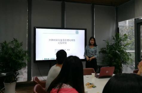 李亚杰首先向大家介绍了鱼骨的化学成分,层级结构以及纳米鱼骨研究现状等研究背景。随后,她又向大家讲述了汇报的主要内容,包括六种常见鱼骨的原料差异;球磨过程中,六种纳米鱼骨悬液的粒径、钙释放率、游离氨基酸、水溶性蛋白和pH等物化特性的变化规律;并初步探讨了原料差异对纳米鱼骨的理化特性差异的影响。最后对研究内容进行小结,并提出下一步的研究方向。