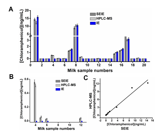 图4 SEIE、HPLC-MS和IE用于检测牛奶样品中的氯霉素