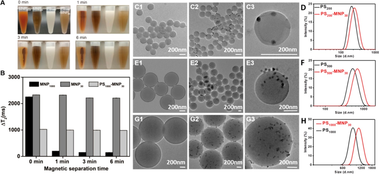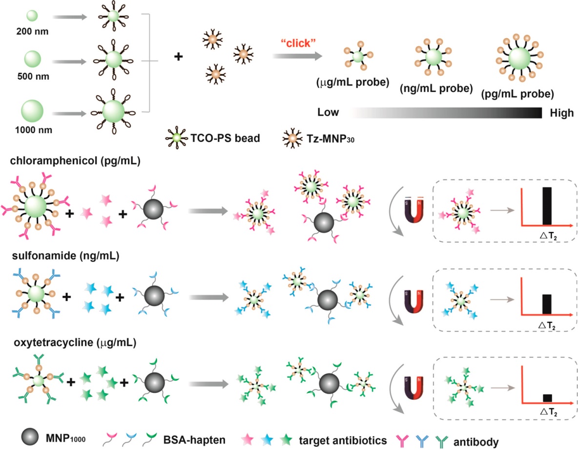 基于上述问题,陈翊平教授课题组构建了一种能够线性可调检测食品基质中多种抗生素残留的磁纳米免疫传感器。通过点击反应在不同粒径的聚苯乙烯微球(Polystyrene beads,PS)上面组装纳米磁颗粒,因为不同粒径的PS微球表面偶联的纳米磁颗粒的数量不同,因此可以制备不同磁信号强度的磁探针,从而实现线性范围的大幅度调节(pg/mL-μg/mL),具有检测浓度范围跨度大的特点。针对不同目标物的浓度不同,选择不同的磁信号探针,进行可以实现浓度范围不同的多种抗生素残留的检测。