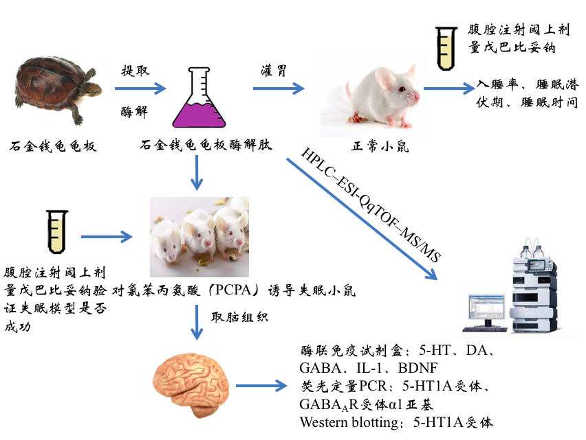 对氯苯丙氨酸(PCPA)可以通过抑制色氨酸羟基化阻断5-HT合成,造成小鼠神经递质系统紊乱,使小鼠失去昼夜节律不能睡眠,可建立失眠模型。戊巴比妥钠可通过抑制脑干网状上行激活系统,起到模拟睡眠效果,根据睡眠潜伏期,睡眠时间可判断小鼠睡眠状况。5-HT、DA、GABA、IL-1、BDNF是脑内与睡眠密切相关的神经递质和细胞因子,通过测定以上因子的变化,可判断小鼠大脑神经递质系统的功能变化情况;进一步采用western blot技术测定5-HT1A受体和GABAA受体α1亚单位的含量变化,有助于推断其可能调节睡眠的机理。最后利用高效液相色谱-电喷雾四极杆飞行时间质谱(HPLC-ESI-QqTOF-MS/MS)联用,鉴定石金钱龟多肽提取物的主要成分结构,有助于寻找镇静催眠作用的关键活性肽成分,为石金钱龟多肽高附加值产品的开发奠定理论基础。