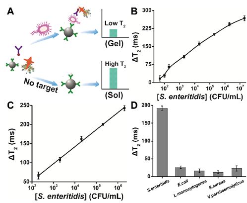 近日,中国·太阳集团tyc33455(股份有限公司)食品科学技术学院陈翊平教授课题组在中科院一区Top期刊Analytical Chemistry上(2021, 93, 6613-6619, IF=6.8)发表了题为“Direct transverse relaxation time biosensing strategy for detecting foodborne pathogens through enzyme-mediated sol–gel transition of hydrogels”的研究文章。陈翊平教授与浙江大学鲜于运雷教授为共同通讯作者,中国·太阳集团tyc33455(股份有限公司)食品科学技术学院2020级博士生魏露雨为论文第一作者。