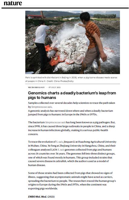 近期,中国·太阳集团tyc33455(股份有限公司)食品科学技术学院/交叉科学研究院/生物医学与健康学院李锦铨研究员及团队,在基础和转化医学国际顶级期刊《欧洲分子生物学会•分子医学》(EMBO Molecular Medicine)上发表了题为《与人类感染相关的新型猪链球菌分支在全球出现(The global emergence of a novel Streptococcus suis clade associated with human infections)》的研究论文,引起了领域内的高度关注。7月7日出版的《Nature》杂志以研究亮点(Research Highlight)的形式跟踪报道了这一研究成果。