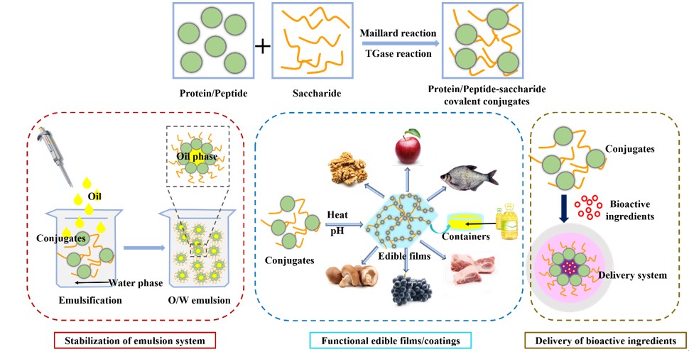 研究背景:蛋白质/多肽和糖类是自然界中两种生物活性物质。近年来,蛋白质/多肽与糖类之间的共价相互作用越来越受到人们的重视。通过蛋白质/多肽与糖类的共价结合得到的产物具有更优异的功能特性,如更好的胶凝性能、热稳定性和持水性。此外,食源性蛋白质/多肽-糖类共价化合物(PSCCs)还具有抗菌、抗糖尿病、抗骨质疏松、抗炎、抗癌、免疫调节等生物活性,广泛应用于功能性食品行业。此外,PSCCs可以作为包装或递送材料,以提高生物活性物质的生物利用度,这将拓展食源性蛋白质和糖类资源的开发。