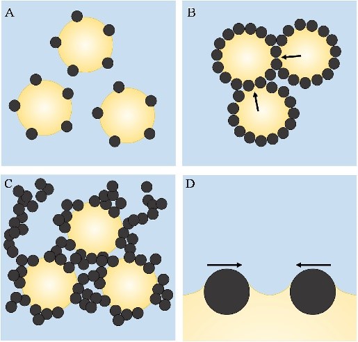 大多数球状蛋白以不同的方向吸附在两相界面上,它们的疏水性空腔面向非极性油相。然而,分子动力学模拟预测,蛋白质在极性增加的界面上随机吸附,并逐渐嵌入到疏水相中。蛋白质在极性较低的界面上经历了增加的界面拉伸应力,导致加速展开。在没有线张力影响的情况下,使用具有均匀润湿性的皮克林颗粒生产的乳液在热力学上是不稳定的,尽管它们在动力学意义上是非常稳定的。热力学稳定性的缺乏源于这样一个事实,即在吸附在液滴表面的颗粒之间仍有一个暴露的油/水界面。事实表明,形成这个裸露界面的正自由能总是超过了颗粒的负吸附贡献。尽管如此,通过使用具有明确规定的适当不同润湿性区域的颗粒(Janus颗粒),颗粒吸附的奉献能够得到明显的提高。当均匀润湿的颗粒吸附到油/水界面时,一些颗粒被转移到较不润湿的阶段。油/水界面张力的降低是吸附的驱动力的来源。