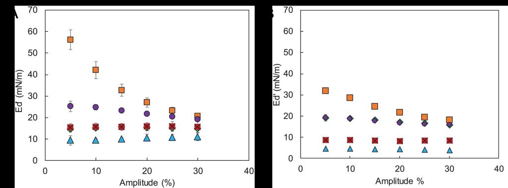 图4.(A)乳清蛋白稳定的气/水界面膜的表面剪切流变学; (B)乳清蛋白和聚集的乳清蛋白在气/水界面的表面压力等温线。