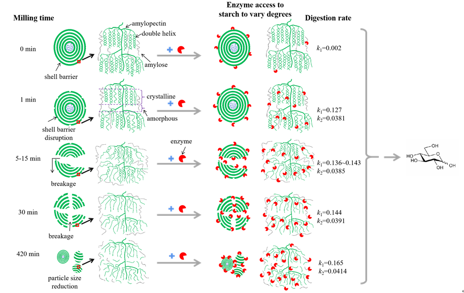 湿法球磨可有效将淀粉粒径降低至纳米级,进而改变淀粉的颗粒形态和分子结构,导致球磨淀粉独特物化性质的产生,如糊化温度和糊粘度低、分散稳定性好、比表面积大等,极大地拓宽了淀粉的应用范围。1879年,Brown和Heron首次发现,淀粉经球磨处理后,其酶水解反应显著加快。而后,多数研究表明球磨淀粉某单一结构的破损与淀粉消化(酶水解反应)速率的增加存在高度相关性,但忽略了其他多尺度结构的协同破损对提高球磨淀粉消化速率的贡献。黄琪琳教授课题组前期实验结果表明,在球磨过程中,颗粒结构最先受损,其次是聚集态结构(包括同心环结构、结晶和非晶薄层结构),最后是直链淀粉和支链淀粉的精细结构。因此,研究推测多尺度结构的阶段性破坏将在不同程度上增强酶与破损部分结合,实现消化率的阶段性增加。