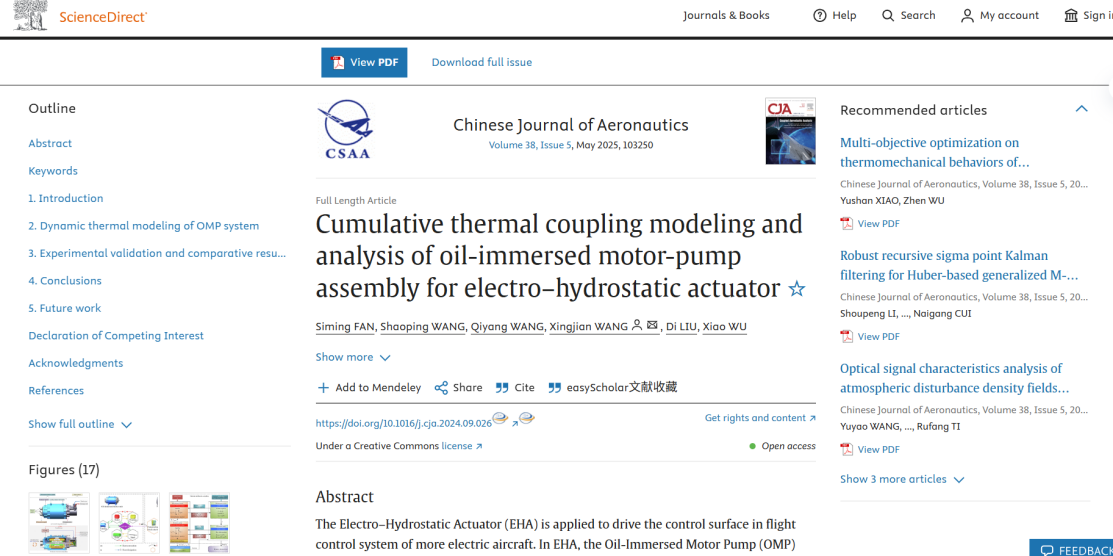 日前,我院王少萍教授团队在《Chinese Journal of Aeronautics》期刊发表了《Cumulative thermal coupling modeling and analysis of oil-immersed motor-pump assembly for electro–hydrostatic actuator》研究论文。该项研究针对油浸式电静液作动器(Oil-Immersed Electro-Hydrostatic Actuator, OI-EHA)在高集成、高功率密度工作条件下的热管理挑战,提出了新型的闭环迭代动态热耦合建模方法,揭示了多物理场热交互及其对系统性能的动态影响机制。论文由樊思明、王少萍、王启扬、王兴坚、刘迪、吴潇共同完成,王少萍教授为团队带头人,王兴坚教授为通信作者。