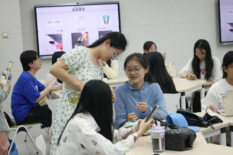 在品鉴环节,李二虎教授亲自示范了开酒和倒酒的标准流程,并鼓励学生们亲自体验。伴着甘醇的酒香,师生们一起品鉴了一款贵人香白葡萄酒,领略了葡萄酒所表现出的“清新雅致、平衡爽净、细腻柔顺、馥郁悠长”特征。