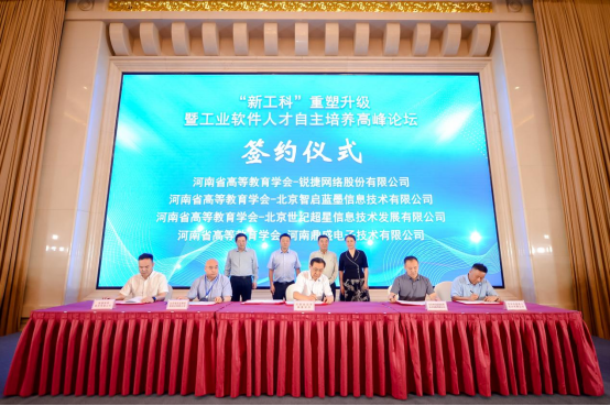 大会还进行了合作签约仪式。河南省高等教育学会同锐捷网络股份有限公司、北京智启蓝墨信息技术有限公司、北京世纪超星信息技术发展有限公司、河南鼎盛电子技术有限公司进行了签约。