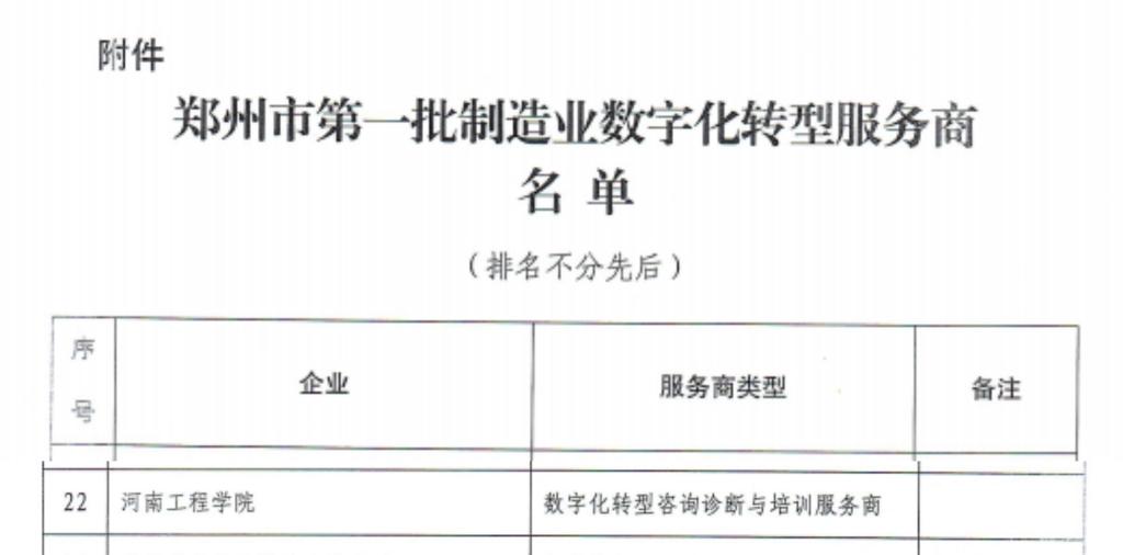 日前,郑州市工业和信息化局公布了郑州市第一批制造业数字化转型服务商遴选结果。经过前期申报、专家评审和现场核查,我校顺利获批“数字化转型咨询诊断与培训服务商”。