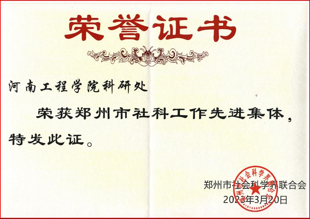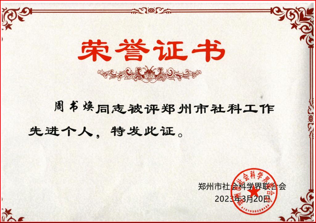 近日,郑州市社科联五届五次全会在郑州博物馆召开。会议传达学习了省社科联九届五次全会精神和全市宣传部长会议精神,总结回顾全市社科联系统2022年工作,部署安排2023年工作,并对2022年度全市30个社科工作先进集体、55名先进个人进行了表彰。我校科研处获得“郑州市社科工作先进集体”荣誉称号,科研处副处长周书焕荣获“郑州市社科工作先进个人”。