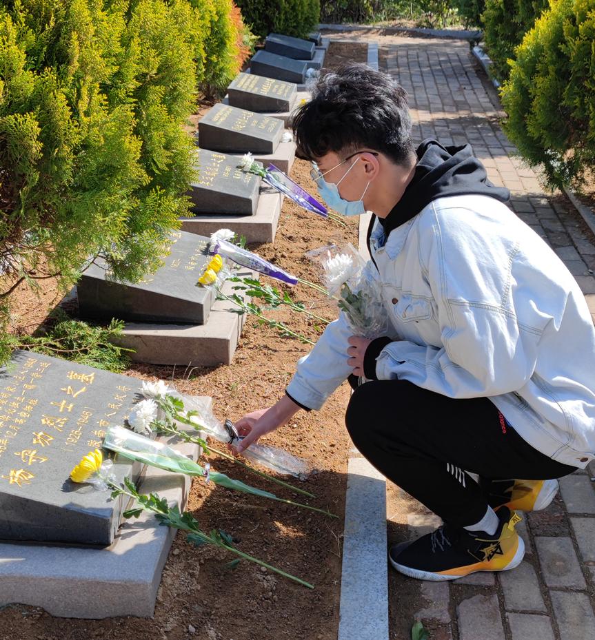 青山有幸埋忠骨,松柏无声祭英灵。来到烈士陵园,韩坤龙首先带领志愿者们宣读开幕词,在党史语录中回顾革命斗争史,回顾中华民族从站起来、富起来到强起来的曲折历史。在仰望烈士墓碑后,几名志愿者怀着沉重的心情为烈士们献上鲜花,并弯腰鞠躬向烈士们献上沉重的悼念。紧接着,全体志愿者有秩序地来到烈士墓碑前驻足默哀一分钟。最后,志愿者们怀着崇敬的心情一起为烈士们扫墓。献花、默哀、扫墓,志愿者们用最传统的方式向牺牲的烈士们表达新时代青年最诚挚的敬意和深深的思念。墓碑上一张张黑白照片深深地印在每位志愿者的心里,志愿者们留下的是对烈士浓浓的哀思和敬意,带走的是革命烈士永垂不朽的爱国之情。