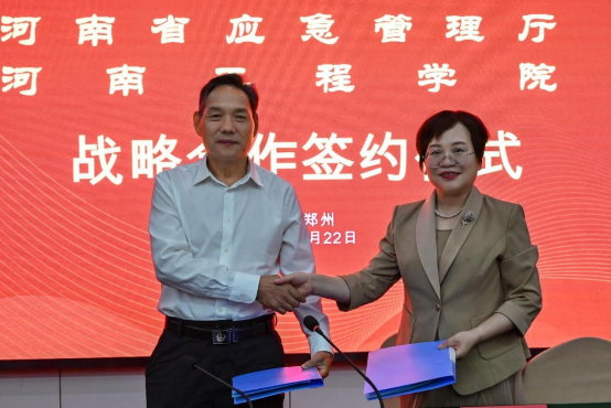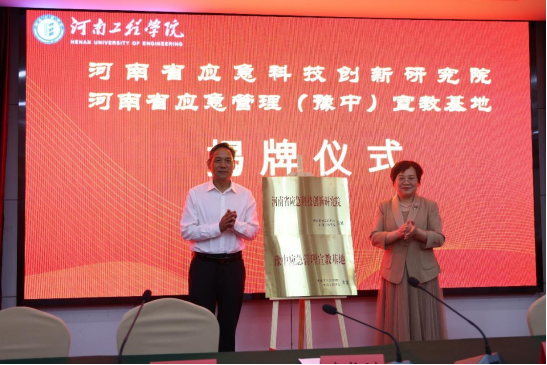 随后,在热烈的掌声中,李长训、张铟代表河南省应急管理厅、河南工程学院签订战略合作框架协议;共同为“河南省应急科技创新研究院”“豫中应急管理宣教基地”揭牌。