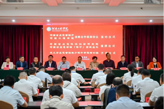 5月22日上午,河南省应急管理厅与河南工程学院战略合作框架协议签署仪式、河南省应急科技创新研究院、豫中应急管理宣教基地揭牌仪式和巩义市应急管理能力提升专题培训班开班仪式在我校南苑宾馆会议室隆重举行。