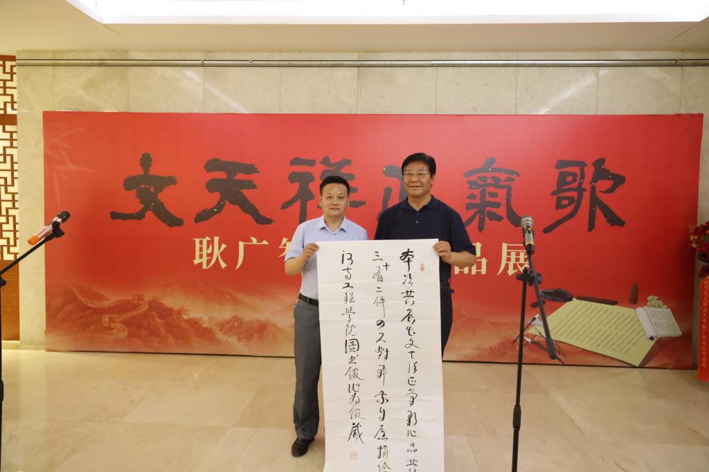 耿广智在展出说明中对文天祥生平和《正气歌》作了介绍,并表示,此次策划以正气歌为内容的书画作品展览,旨在歌颂文天祥崇高的民族气节和强烈的爱国主义精神,表达对青年人的关爱和希冀,希望同学们立志、勤学、笃行、修德,始终与时代同呼吸、与祖国共命运、与人民同奋斗,在实现中华民族伟大复兴中国梦的征程中书写出彩人生。