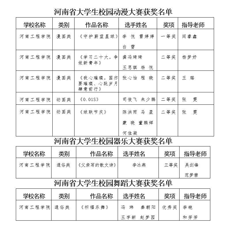 近日,由中共河南省委宣传部、河南省教育厅、共青团河南省委、河南省文化和旅游厅、河南省科学技术厅、河南省学生联合会共同举办的“河南省第十九届大学生科技文化艺术节”各奖项揭晓。我校在比赛中成绩优异,在参与的七项比赛中荣获9项荣誉。其中荣获一等奖2项、二等奖5项、三等奖1项,优秀奖1项。河南省大学生科技文化艺术节是涵盖征文、书法、篆刻、摄影、舞蹈、声乐、主持、曲艺等多种艺术形式,以培养学生创新精神和实践能力、展现大学生风采为目标的系列竞赛活动。