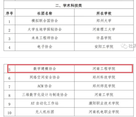 根据省委教育工委、省教育厅《关于开展2023年全省高校“十佳学生社团”评选的通知》(教思政函〔2023〕387号)要求,经学校推荐、专家评审等环节,评选出六类十佳学生社团共60支。其中我校数学建模协会成功入选学术科技类全省高校“十佳学生社团”。