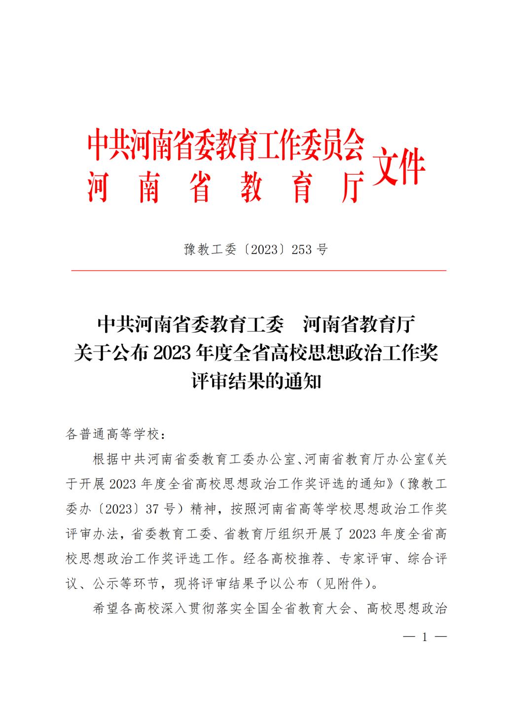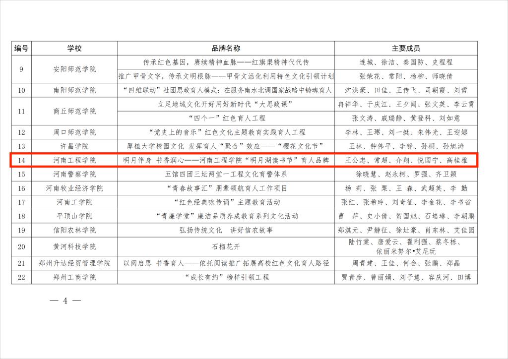 近日,由中共河南省委教育工委、河南省教育厅组织开展的2023年度全省高校思想政治工作奖评选结果揭晓,我校图书馆申报的《明月伴身 书香润心—河南工程学院“明月湖读书节”育人品牌 》荣获“河南省高校思想政治工作优秀品牌”,此项目成功入选是图书馆在思想政治工作品牌创建上的新突破,也是学校在高校思想政治工作领域项目申报取得的新成绩。