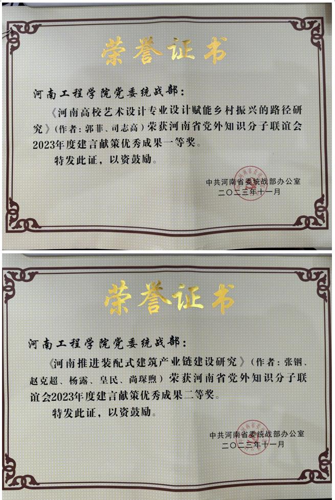 近日,省委统战部下发豫统办〔2023〕17号《关于河南省党外知识分子联谊会2023年度建言献策优秀成果的通报》,我校组织申报的《关于河南高校艺术设计专业设计赋能乡村振兴的路径研究》调研课题荣获建言献策优秀成果一等奖,《河南推进装配式建筑产业链建设研究》调研课题荣获建言献策优秀成果二等奖。