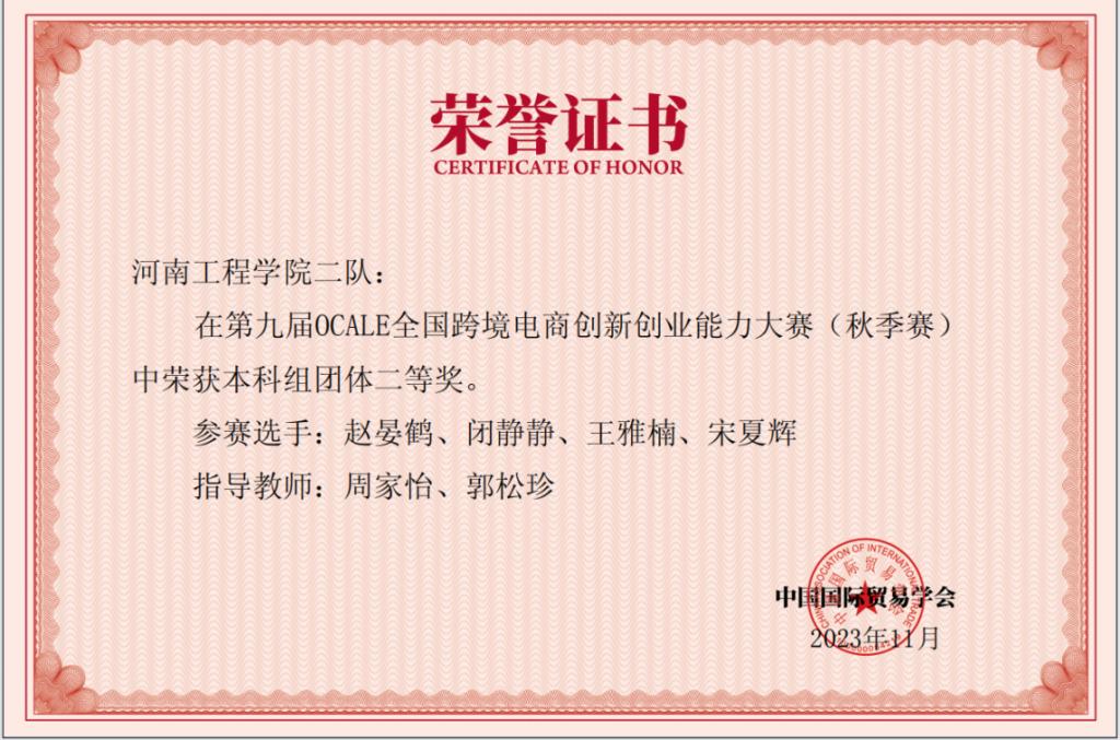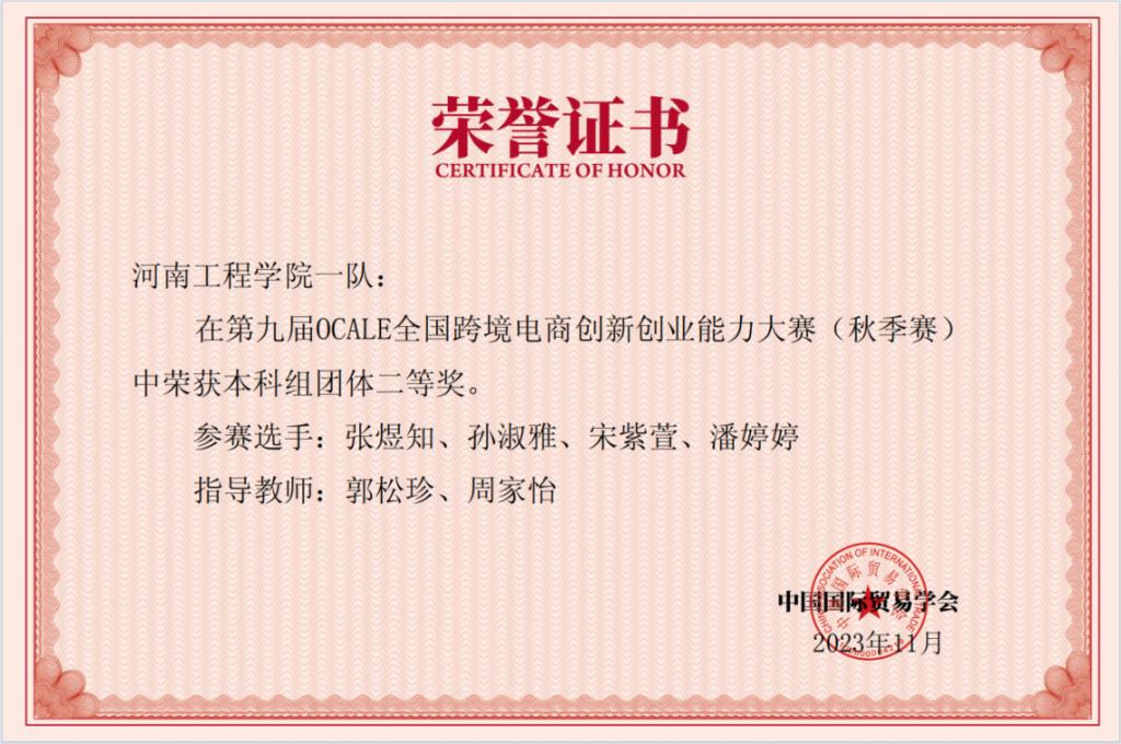 近日,由国家一级学会——中国国际贸易学会主办的第九届OCALE全国跨境电商创新创业能力(秋季赛)决赛成绩揭晓,经过三天12个回合的激烈角逐,我校经济贸易学院派出的两支参赛队河南工程学院本科一队和本科二队全部获奖,同时荣获团体二等奖。本次大赛共设16个赛站,共有来自全国29个省(市)、自治区504所院校的2486支参赛队,是目前对外经贸领域参赛人数最多、最有影响力的大赛之一。