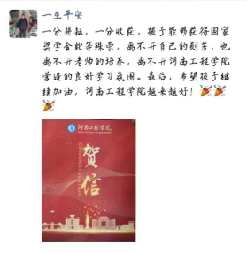 心怀感恩,励志前行。学校精心准备的贺信,作为一份特殊的新春礼物送至家长手中,在与家长分享学生收获与喜悦的同时。更是加强家校联动、协同育人的有效举措。一封封喜报饱含着学校、老师对学生的殷殷希望和家长对学校工作认可的感谢,让更多的家长分享学生成长过程中的收获与喜悦的同时,激励青年学生树立正确的价值观,感恩祖国、感恩社会、感恩学校,以青春之我,创建青春之国家。
