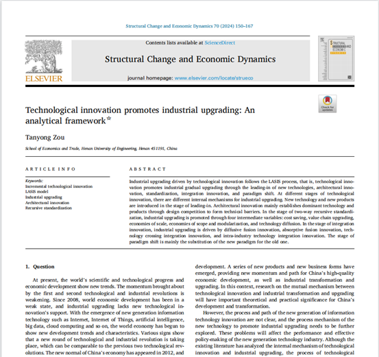 近日,国际知名学术期刊《Structural Change and Economic Dynamics》(《结构变迁与经济动态》)正式发表我校经济贸易学院教师邹坦永副教授的独著研究成果《Technological innovation promotes industrial upgrading: An analytical framework》(《技术创新驱动产业升级:一个分析框架》)。
