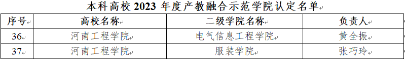 近日,河南省教育厅办公室下发了《关于公布河南省本科高校2023年度产教融合系列项目名单的通知》(教办高〔2024〕13号),我校“产教融合视域下地方行业特色高校现代产业学院建设及运行模式研究”等2个项目立项为河南省本科高校2023年产教融合重点研究项目,“产教融合背景下环境工程专业实践教学育人体系建设”等3个项目立项为河南省本科高校2023年产教融合一般研究项目,“基于产教融合的《税收理论与实务》课程建设”等4个项目认定为河南省本科高校2023年产教融合品牌项目,电气信息工程学院、服装学院认定为河南省本科高校2023年产教融合示范学院。