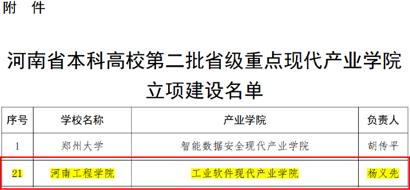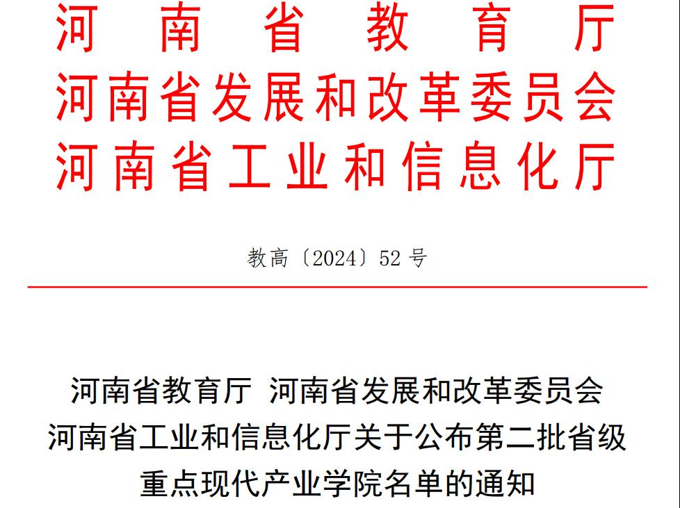 近日,河南省教育厅、河南省发展和改革委员会、河南省工业和信息化厅下发了《关于公布第二批省级重点现代产业学院名单的通知》(教高〔2024〕52号),我校“工业软件现代产业学院”获批河南省本科高校第二批省级重点现代产业学院。