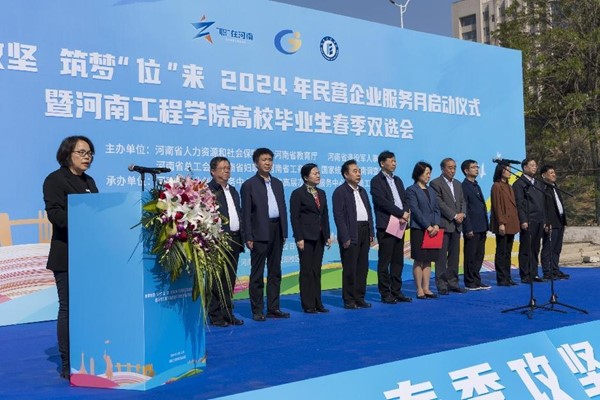 4月12日,省人力资源和社会保障厅、省教育厅、省退役军人事务厅、省总工会、省妇女联合会、省工商联、国家统计局河南调查总队共同主办,河南工程学院联合省就业创业服务中心、省高层次人才服务中心承办的“春季攻坚 筑梦“位”来——2024年民营企业服务月启动仪式暨河南工程学院高校毕业生春季双选会”在龙湖校区举行。省人力资源和社会保障厅二级巡视员李四清、校党委书记刘永涛、校长李利英、副校长张巧玲等出席活动。