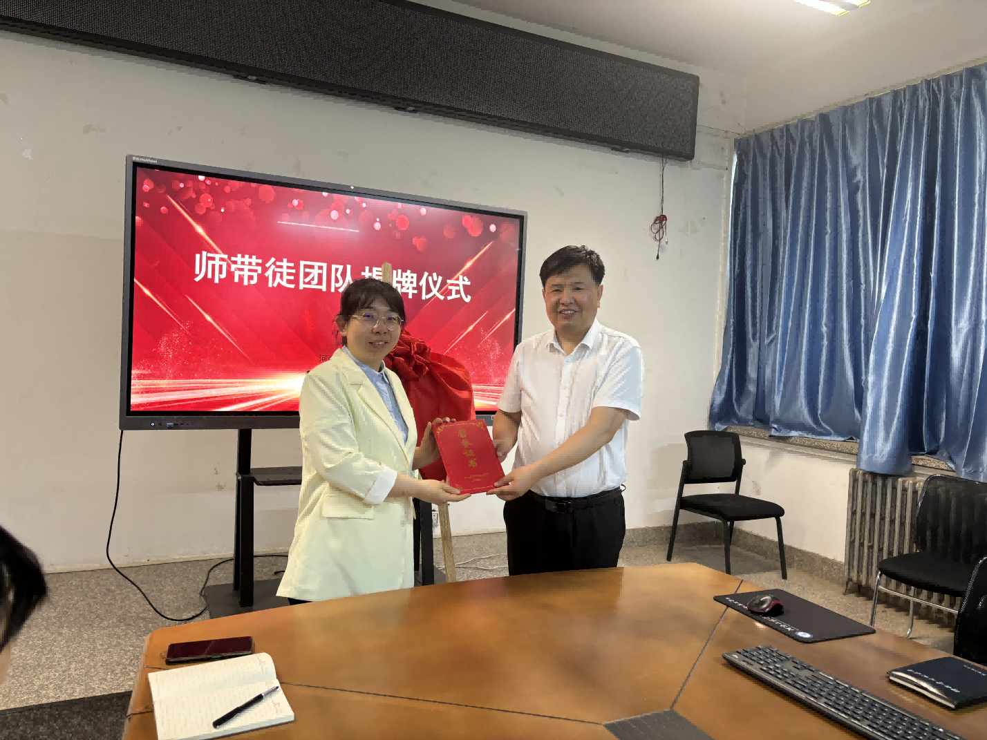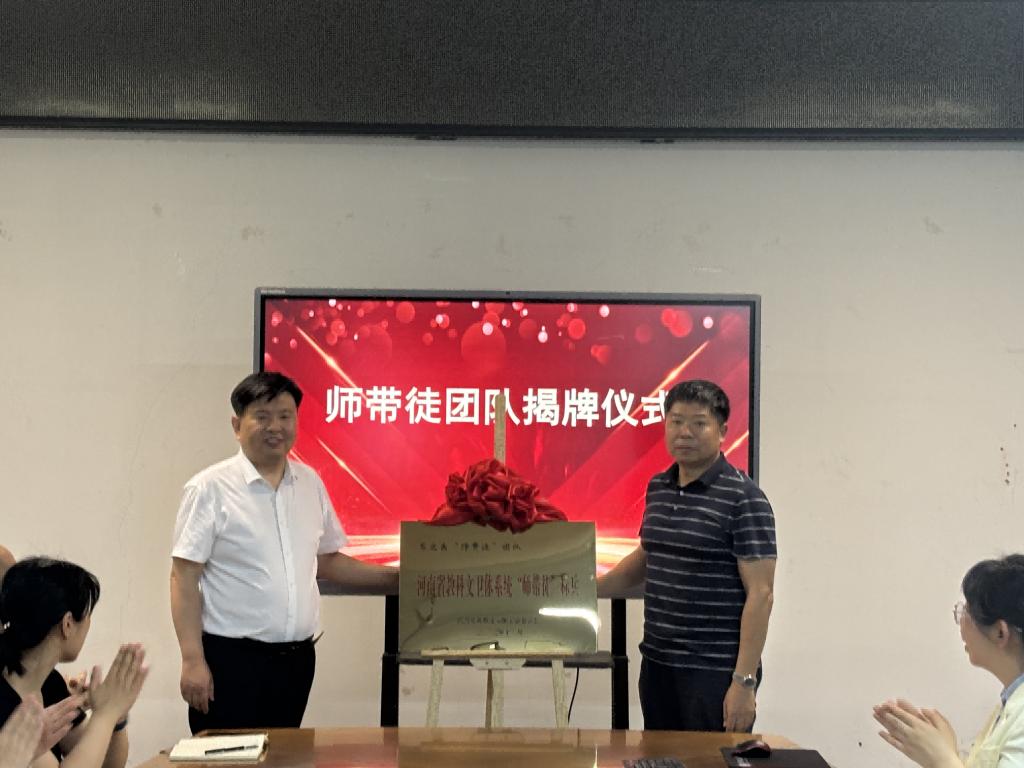 5月20日上午,河南省科教文卫体系统“师带徒”团队揭牌仪式在桐柏路校区举行。校党委副书记赵红亮,工会副主席卞卡,纺织工程学院党政班子成员及师生代表参加仪式。仪式由校工会副主席卞卡主持。