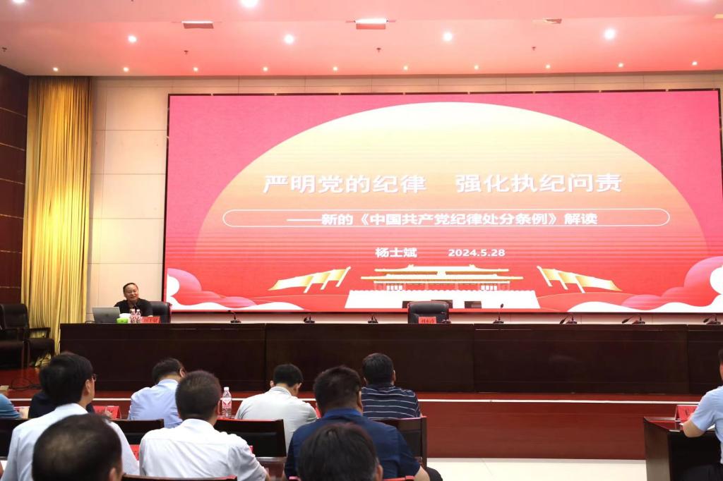 杨士斌以《严明党的纪律强化执纪问责》为题,聚焦新修订的《中国共产党纪律处分条例》(下称《条例》),从我党历史上发生的党纪学习教育典型案例切入,结合大量的史实、鲜活案例,全面回顾了《条例》制定和修订的历史沿革,深入阐释了《条例》修订的重要意义,深刻分析了《条例》的时代特征,详细讲解了《条例》的主要内容。他强调,全体党员干部要将《条例》作为自己的行为准则,将党章党规党纪内化于心、外化于行,融入日常、抓在经常,真正做到学纪、知纪、明纪、守纪。