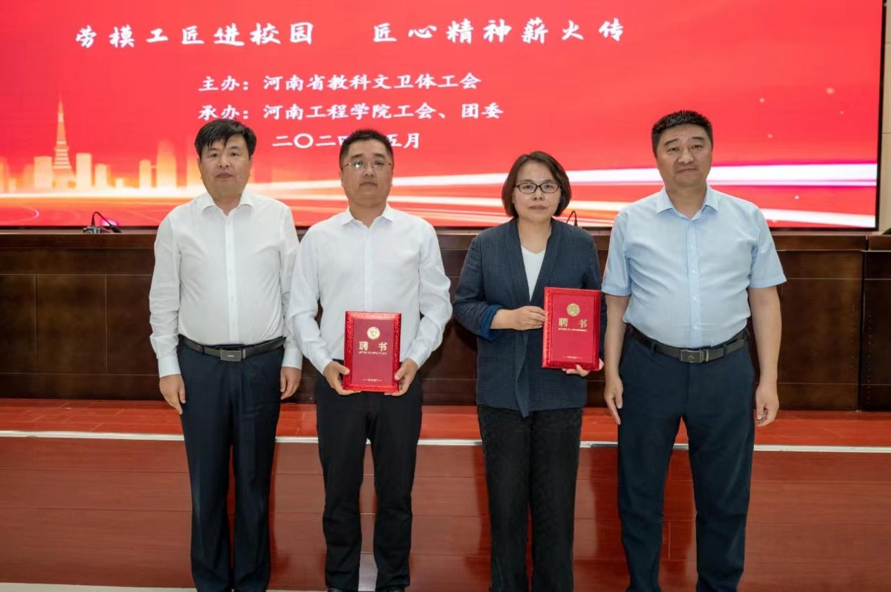 为了让同学们能够更好地走近劳模、学习劳模,我校聘请霍楠楠、张巧玲两位劳模为“劳模工匠兼职辅导员”,张学勇和赵红亮向两位劳模颁发了聘书。