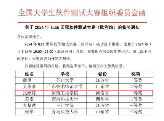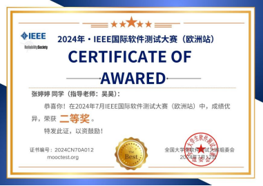 在近日公布的2024年IEEE国际软件测试大赛成绩中,我校软件学院张婷婷同学荣获大赛二等奖,这是我校学子在这一领域中实现了“零”的突破。