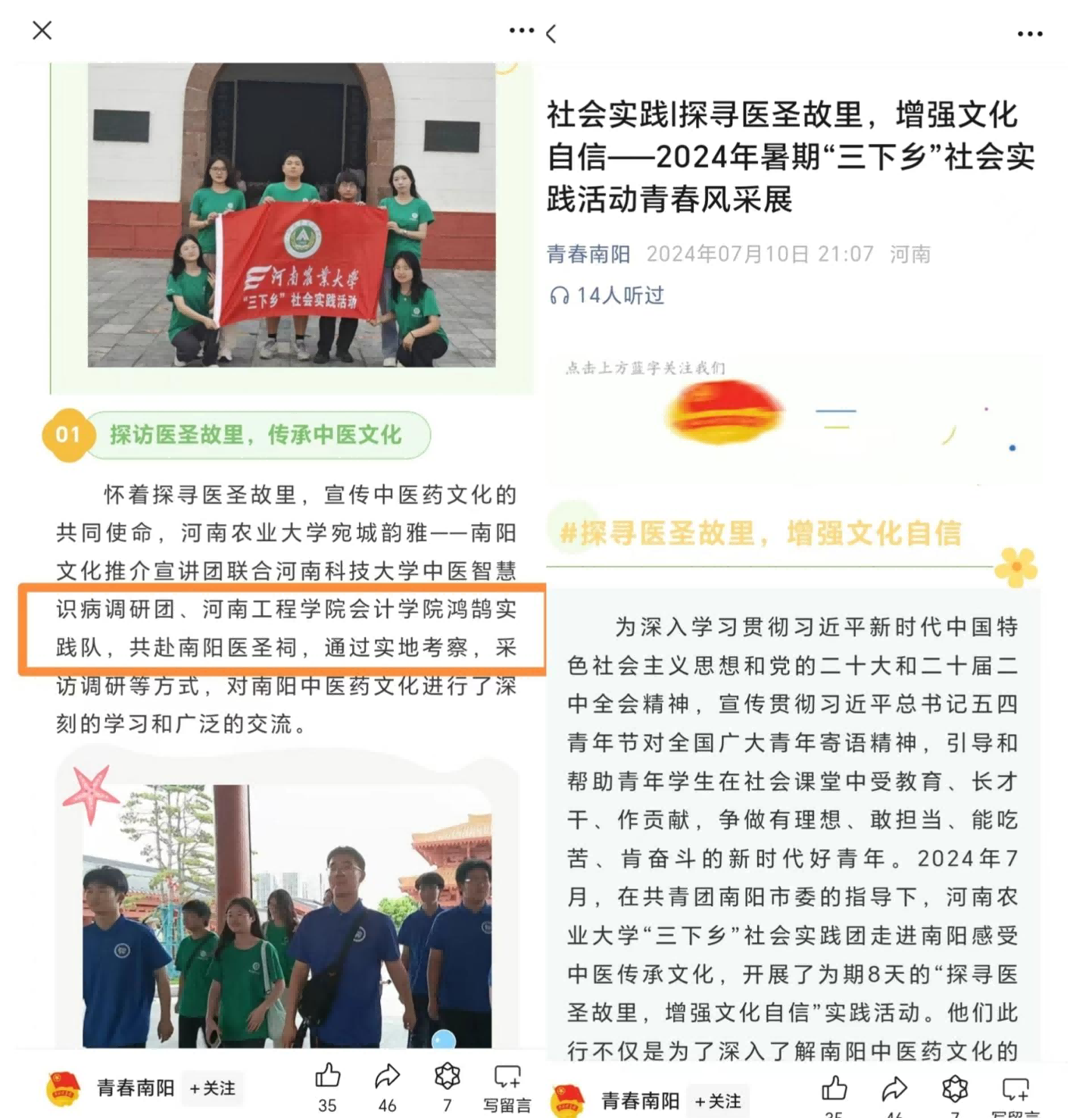 为了传承和弘扬中医药文化,深入了解中医药产业的发展,培养青年学生的社会实践能力,7月,会计学院鸿鹄实践团赶赴南阳市,围绕文化宣讲、参观学习、志愿服务等内容开展一系列社会实践活动。