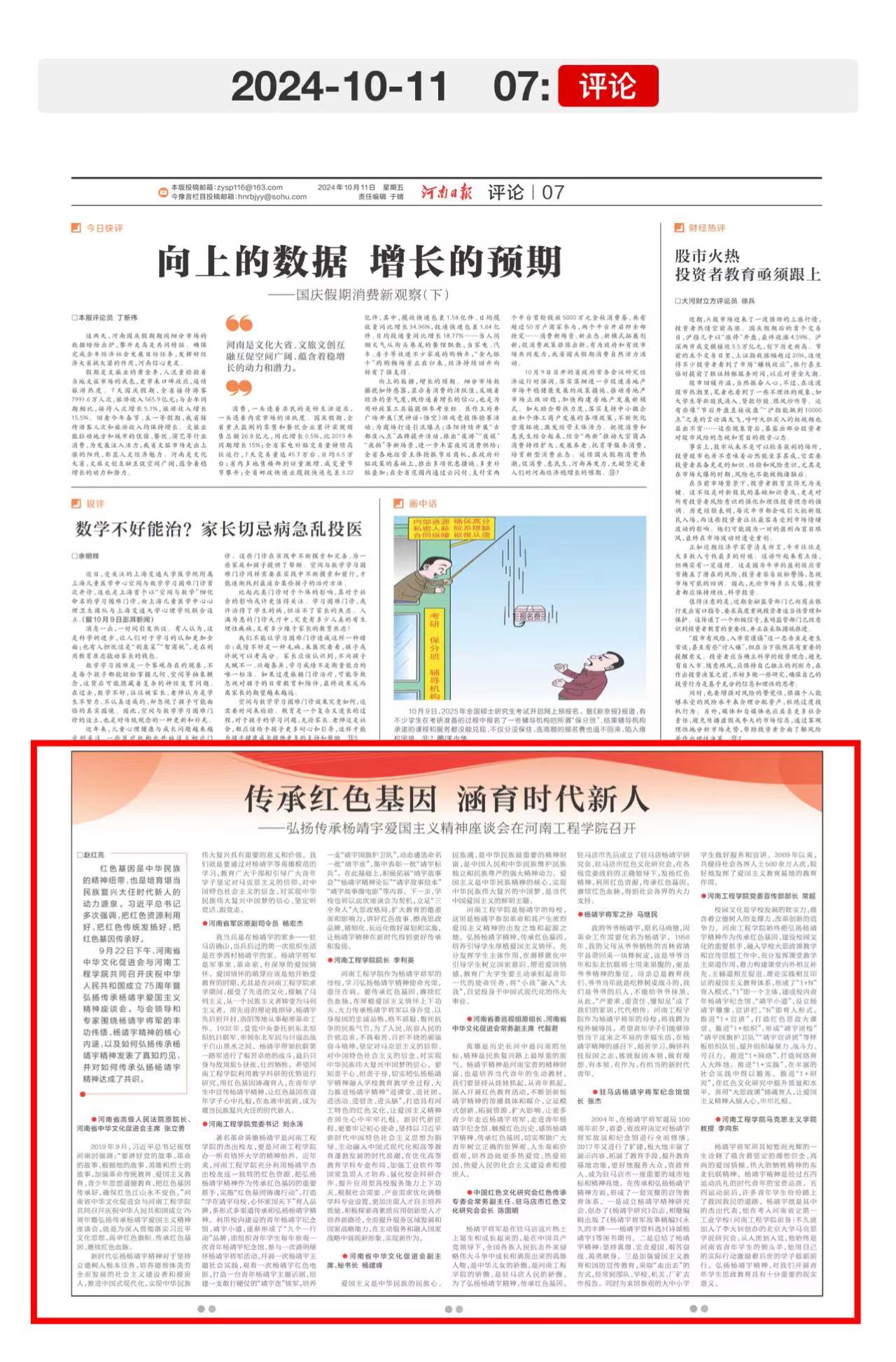 10月11日,《河南日报》以《传承红色基因 涵育时代新人——弘扬传承杨靖宇爱国主义精神座谈会在河南工程学院召开》为题进行了专题报道。