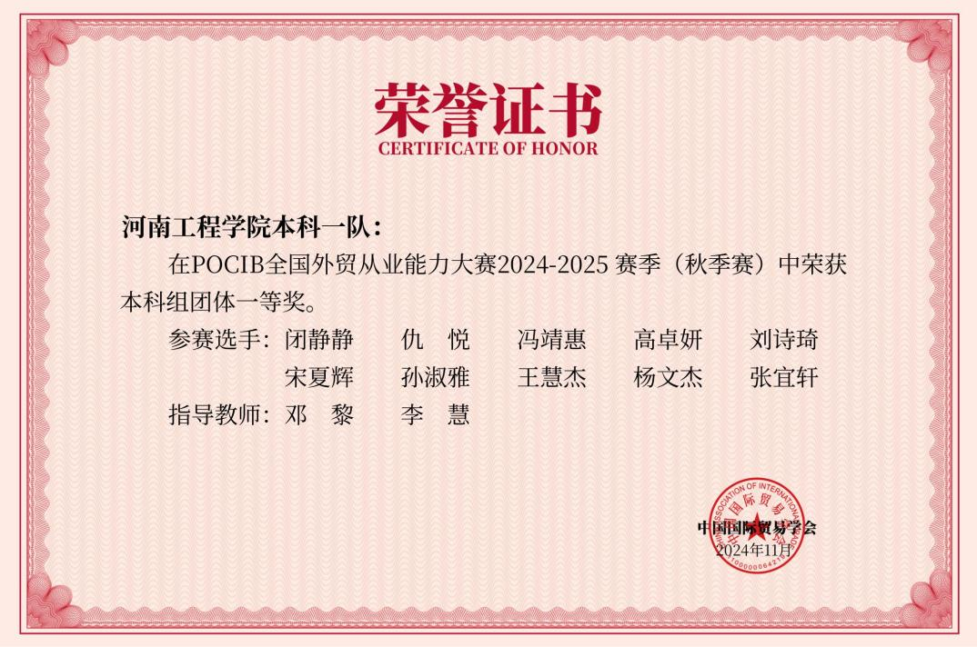 近日,第十四届POCIB全国外贸从业能力大赛2024-2025赛季(秋季赛)成绩揭晓,由经济贸易学院选派的我校本科队荣获团体一等奖,邓黎、李慧两位老师荣获优秀指导教师一等奖,闭静静同学荣获个人二等奖,仇悦等同学荣获个人三等奖。