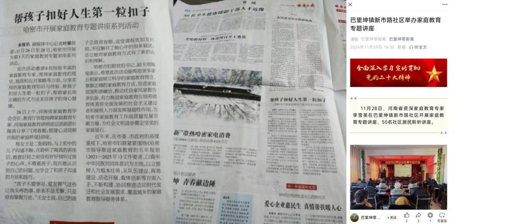 李雪英老师围绕不同年龄阶段人群特有性格特点、心理发展变化,找准切入点,和与会家长共同解读青春期密码,读懂少年心理,出色完成哈密市和巴里坤哈萨克自治县4场次16学时专题讲座。讲座通过分析讲解、案例剖析、互动体验,提出了有针对性、实用性的解决办法,使在场的家长们感同身受,深切共鸣,大家纷纷表示讲座内容贴近生活、方法简单且实用、收益颇丰,赋能幸福感、获得感,使他们提升自身心理能量,找到改善家庭亲子关系、帮助孩子成长的“金钥匙”。