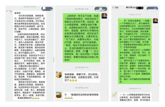 以访润心,用爱呵护。各学院(书院)相关领导和辅导员老师把对学生的关怀“落实到家”,做到假期增质不打烊,与家长亲切交流,分享学生的成长、困惑、进步……做学生前行的“点灯人”“领航人”“掌舵人”。其中,会计学院辅导员张浩清老师利用寒假时间在家访工作的基础上,与其所带班级的所有同学进行了沟通交流,深受学生好评,家长连连称赞,表示感谢。
