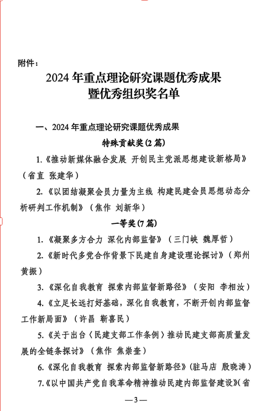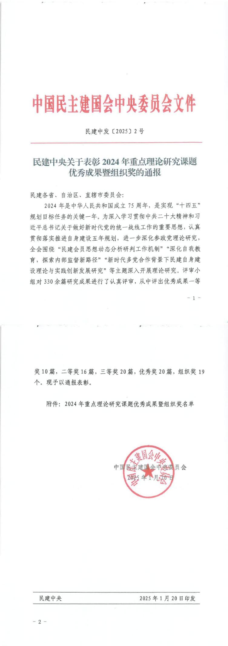 近日,民建中央下发《关于表彰2024年重点理论研究课题优秀成果暨优秀组织奖的通报》,我校经济贸易学院院长、新郑市人大代表、民建会员张建华教授撰写的《推动新媒体融合发展 开创民主党派思想建设新格局》被评为“2024年重点理论研究课题优秀成果二等奖”。同时该研究成果被评为民建河南省委会“2024年重点理论研究课题优秀成果特殊贡献奖”。