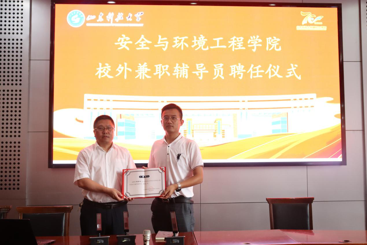 会上,安全学院聘请张君旭为学院校外兼职辅导员,王建友向张君旭颁发聘书。(通讯员:时林超  赵阳)