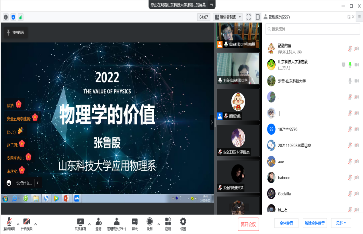 张鲁殷教授以牛顿、伽利略、麦克斯韦等名人的有趣经历开场用幽默的语言引发了同学们对物理学的兴趣。随后以物理公式为例,讲解了学习物理的方法,让同学们更深入地了解物理作为一门基础学科的重要意义张教授更鼓励大家积极参加物理竞赛,提高自身水平和素质最后,张教授嘱托同学们努力学习,表示会持续为同学们的学习提供有力帮助。