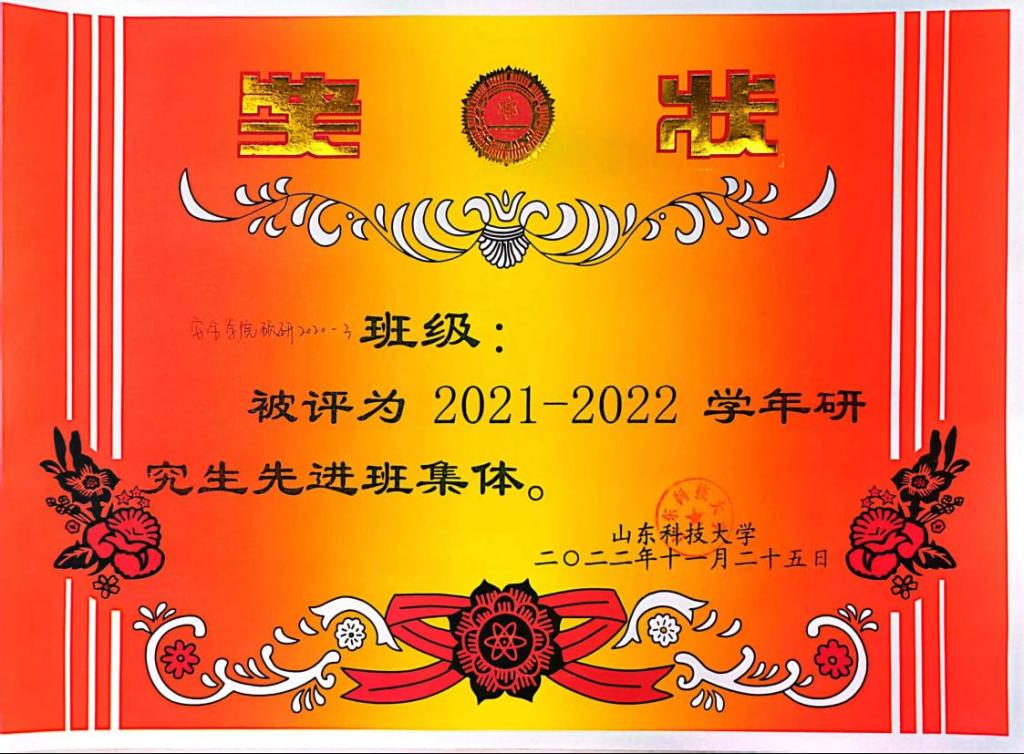 特色鲜明,营造全面发展氛围。班级同学立足安全工程专业,关注时事社会热点,搭建平台,投身实践,展现使命担当,积极参加文体活动、社会实践和志愿服务工作。在文体活动方面,组织班级同学积极参加研究生文体活动,与其他班级联合开展素质拓展活动,劳逸结合,加强团队建设;在社会实践和志愿服务方面,班级以学校驻地为中心,辐射西海岸新区和青岛市,涉及全国多个省份,与学校周边社区建立点对点志愿服务,利用周末、假期深入社区服务,寒暑假积极参加家乡组织的疫情防控等志愿服务活动。王妍获山东科技大学“十佳歌手”,石梦丽获山东科技大学校运会400米田赛二等奖;团支部书记王德洁联合学院研究生组建“红心圆梦”国家级社会实践团队,并成功获批2022年“井冈情·中国梦”全国大学生暑期社会实践专项行动;李方、杨盼盼担任跨国公司领导人青岛峰会大会志愿者,服务国际国内活动数十场;刘双磊获得吉林省抗击新冠疫情优秀志愿者荣誉称号。两年多来,班级累计获得校级文体活动奖励35项,院级文体活动奖励10项,主办班级志愿服务活动10余场,参与国家级志愿服务项目3项,省部级志愿服务项目7项,地市级(校级)志愿服务项目20余项,获校级志愿服务班级同学参与率达95%以上。