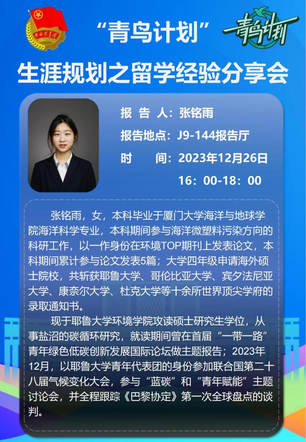 点击:为服务学生学业发展、拓展国际视野、更好规划学习生活,12月26日,安全学院在J9-144报告厅举办“青鸟计划-生涯规划之留学经验分享会”。本次分享会由耶鲁大学硕士研究生张铭雨主讲,安全学院部分本科生参加。