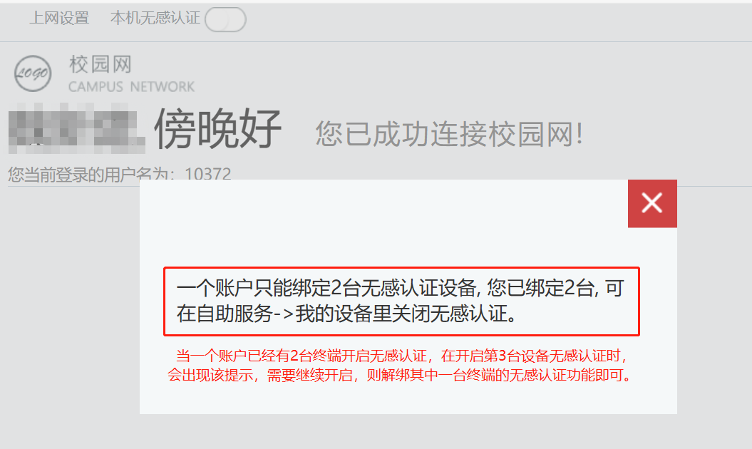 若一个校园网账号已有2台终端开启无感认证功能,在开启第三台设备时,会出现以下提示,若需要继续开启,打开自助服务网址,解绑其中一台设备即可。