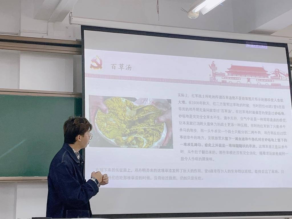 会议第一项,由副书记黄云飞主持支部内微党课评比,各参赛人以“长征路上的红色食品”为主题,选取长征路上的其中一个城市的红色背景食品作为分享内容,讲述食品背后的故事与意义。黄云飞以百草汤为例,讲述了红军战士过草地时,只能吃牛肚子里未消化的草根为食的艰苦岁月。