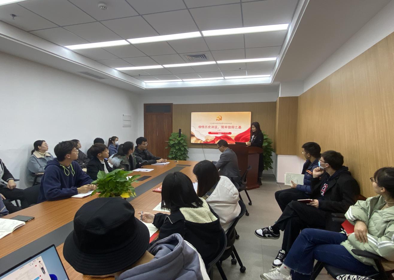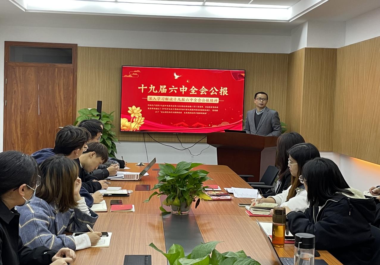 会议第一项,副院长刘石林带领支部成员解读十九届六中全会公报。 “过去我们为什么能够成功,未来我们怎样才能继续成功”,刘石林从肯定党的十九届五中全会以来习近平受中央政治局委托作的工作总结、肯定党的十九届五中全会以来中央政治局的工作、总结党的百年奋斗重大成就和历史经验、党的十八大以来中国特色社会主义进入新时代等七个方面作出了回答。